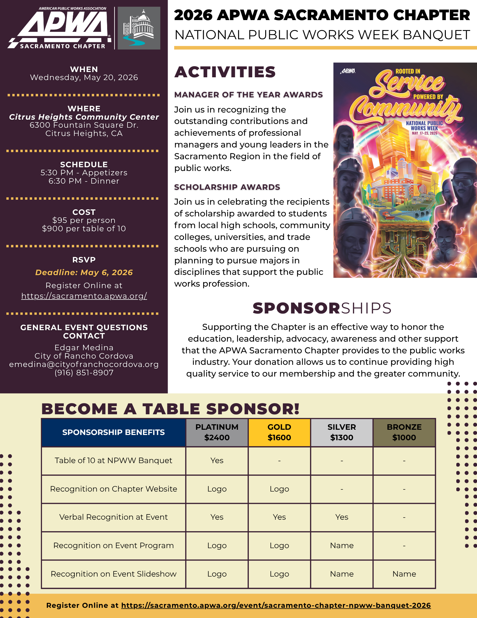 • Manager of the Year Awards! Join us in recognizing the outstanding contributions and achievements of professional managers and young leaders in the Sacramento Region in the field of public works.